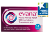 Evana® Heavy Period Relief 500mg Tablets (Tranexamic acid) - PL 14251/0300. Indications: Reduction of heavy menstrual bleeding over several cycles in women with regular, 21-35 day cycles with no more than 3 day variation. Posology: Two tablets to be taken, 3 times a day at the onset of heavy menstrual bleeding, for a maximum of 4 consecutive days. Maximum daily dose of 8 tablets. Contraindications: Hypersensitivity to the active substance or any of the excipients, severe renal impairment, mild to moderate renal insufficiency, active thromboembolic disease, previous thromboembolic event and a family history of thrombophilia, haematuria, irregular menstrual bleeding, those taking warfarin, anticoagulants or oral contraceptives, pregnancy, fibrinolytic conditions following DIC, or history of convulsions. Precautions: Women aged over 45, those who are diabetic or obese, polycystic ovary syndrome, a family history of endometrial cancer, and those receiving unopposed oestrogen or tamoxifen, breastfeeding . Side effects: Common (≥1/100 to <1/10): Nausea, vomiting, diarrhoea. Uncommon (≥1/1,000 to <1/100): Allergic skin reactions. Very rare (<1/10,000): Hypersensitivity reactions including anaphylaxis. Frequency unknown: thromboembolic events, retinal/artery occlusion, impaired colour vision or visual disturbances, seizures. MA holder: Manx Healthcare Ltd, Unit 2, Bosworth Avenue, Tournament Fields, Warwick, CV34 6UQ, UK. Classification: P. RRP: 18 tablets: £14.95. Date: February 2025 – For full information see: evanaperiods.com/hcp/evana/spc.